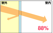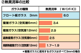 断熱性能を表すものとして、どれだけの熱量が窓ガラスを通過するかを示す熱貫流率があります。この場合、使用するガラスの厚さが同じなら、空気層の層数で性能が決まります。一般的な複層ガラスで1枚ガラスの約2倍、Low-Eガラスを使用したものでは、さらに断熱性能は向上します( ②「熱貫流率の比較」)。また、夏には日射を遮蔽し、外からの熱の侵入を防ぐことも、コーティングした複層ガラスの大きな利点です。①「日射侵入率の比較」で分かるように、通常の単板ガラスと比べてみると、遮熱複層ガラスでは室内に侵入する日射熱は半分程度になります。さらに、ブラインドやカーテンをかけると、その効果は一層上がることになります。