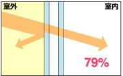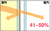 単板ガラスの場合、室内に入ってくる日射熱は太陽光線の全量の約88%ありますが、遮熱複層ガラスの場合は、約41~50%。つまり、太陽熱の半分をカットする働きがあります。そのため、天窓から入る夏の日差し、西日、ベランダの照り返しなどを抑え、冷房効率をアップさせることができます。平成11年省エネルギー基準で求められている日射遮蔽(日射熱侵入率)について、庇やブラインド等を設置しなくても基準をクリアすることが可能です。また、冬は暖房による熱エネルギーを金属被膜で反射しますので、外部に熱を逃がさず暖房効率を高めます。